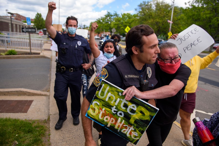 At least two officers in Connecticut joined demonstrators as they marched through Bristol Monday.