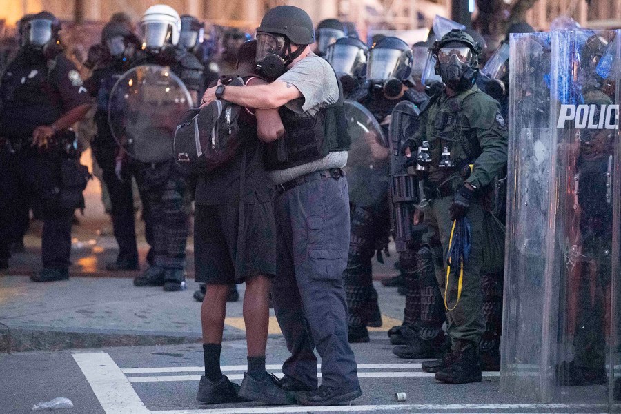 In Minnesota, the state where Floyd was killed, an officer and a demonstrator shared an emotional embrace during a protest in St. Paul.