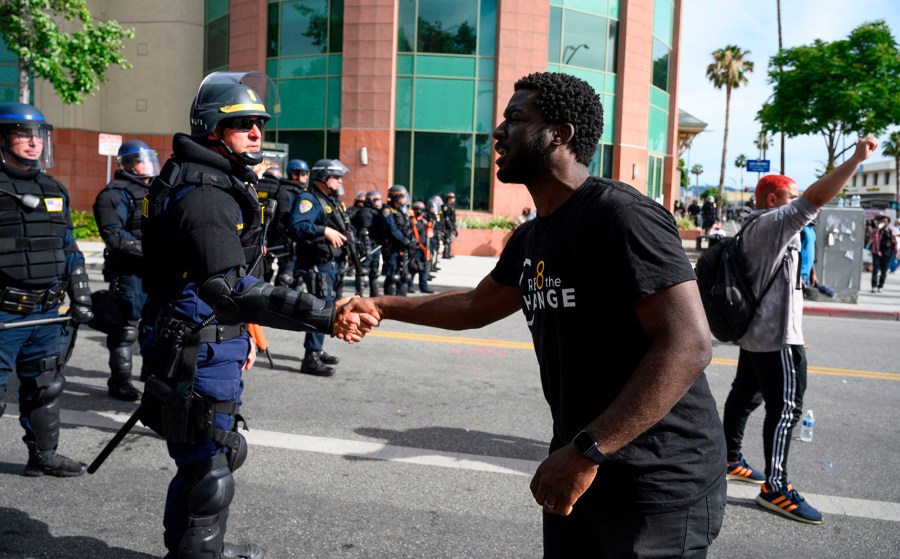 On the west coast, protestor Kevin Welbeck of Cre8 The Change shook hands with a California Highway Patrol officer during a protest in the Van Nuys area of Los Angeles.