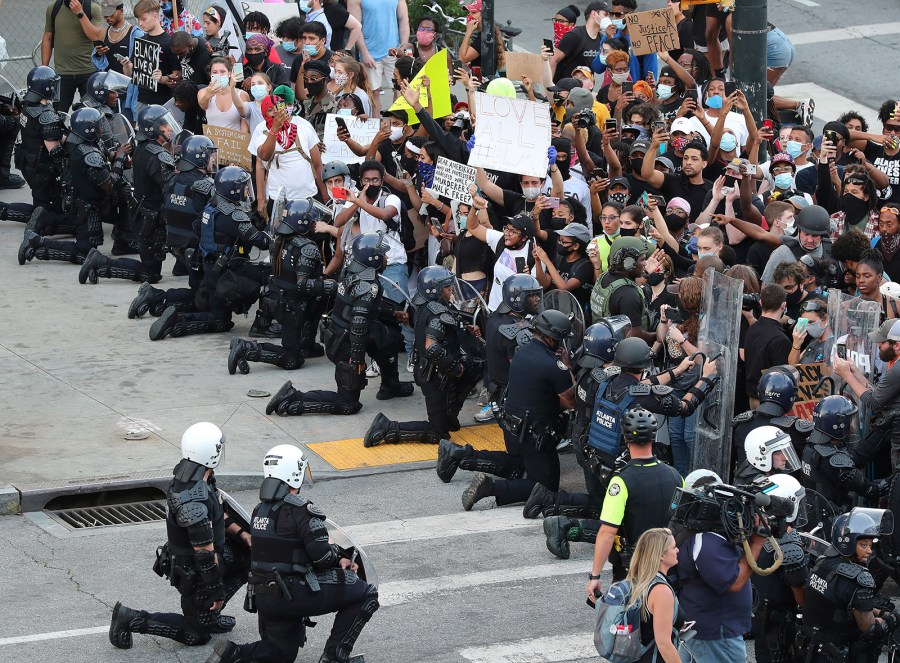 In Atlanta, Georgia, a line of police officers holding shields during a protest Monday near Centennial Olympic park kneeled in front of demonstrators.